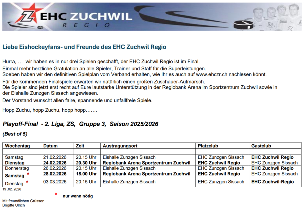 | 2. Liga Gruppe 3 ZS | 15.02.2026 | 18:00 Uhr | EHC Zuchwil Regio | EHC Meinisberg I | Regiobank Arena, 4528 Zuchwil SO |