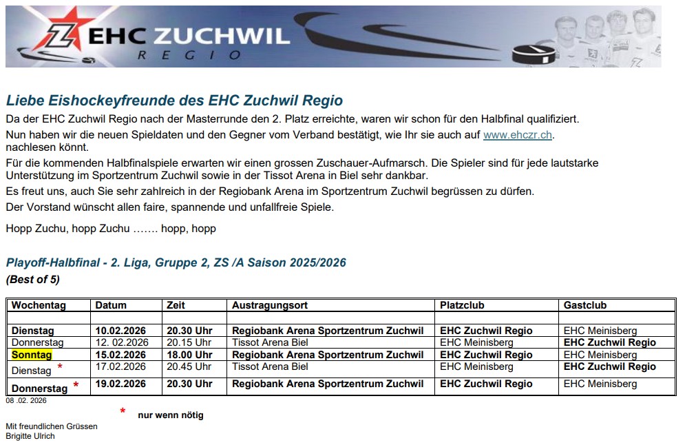 Im dritten Playoff-Duell zwischen dem ECH Zuchwil Regio und dem EHC Meinisberg setzte sich Zuchwil eindrucksvoll mit 5:0 durch und zieht damit ins Finale ein. Vor heimischem Publikum zeigte das Team eine abgeklärte und effiziente Leistung.